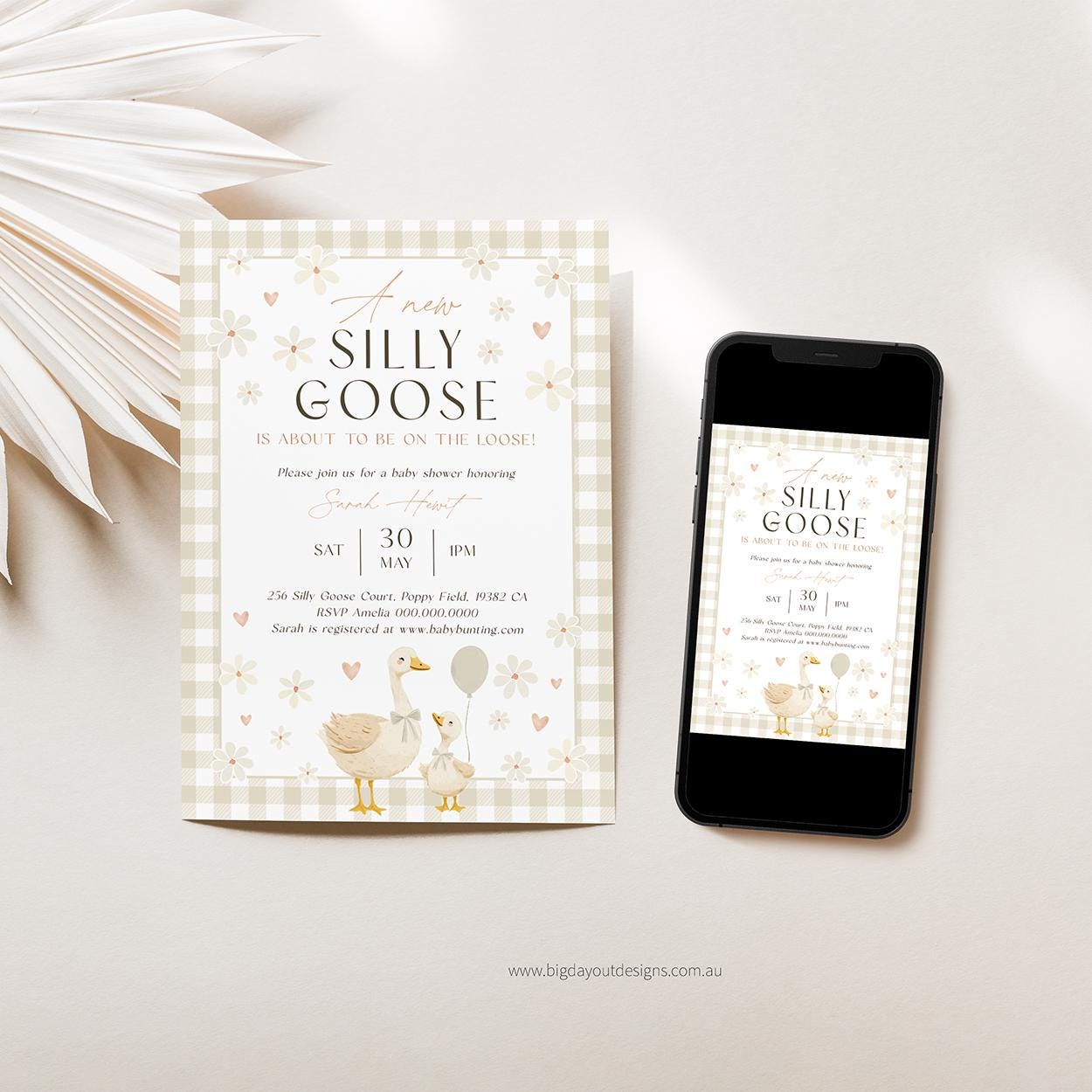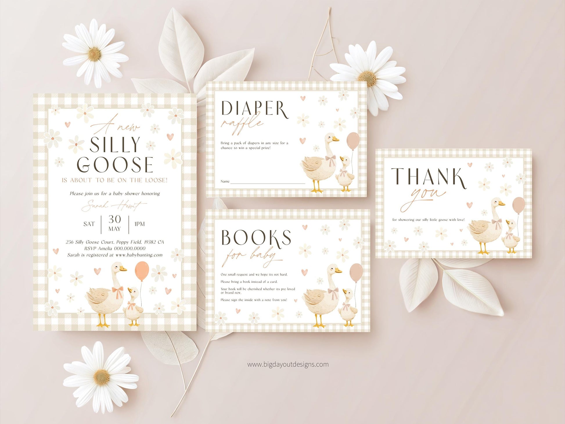 Celebrate the arrival of your little one with our delightful Goose Baby Shower Invite set in a charming beige gingham design! Perfect for a gender-neutral occasion, this whimsical invitation bundle features our adorable "little goose on the loose," making it a perfect choice for both boys and girls.