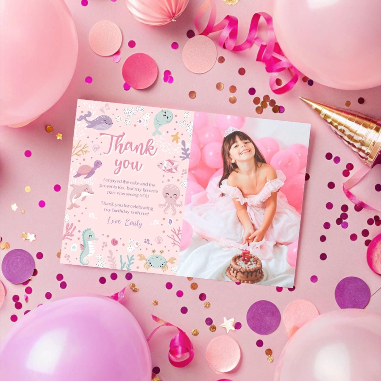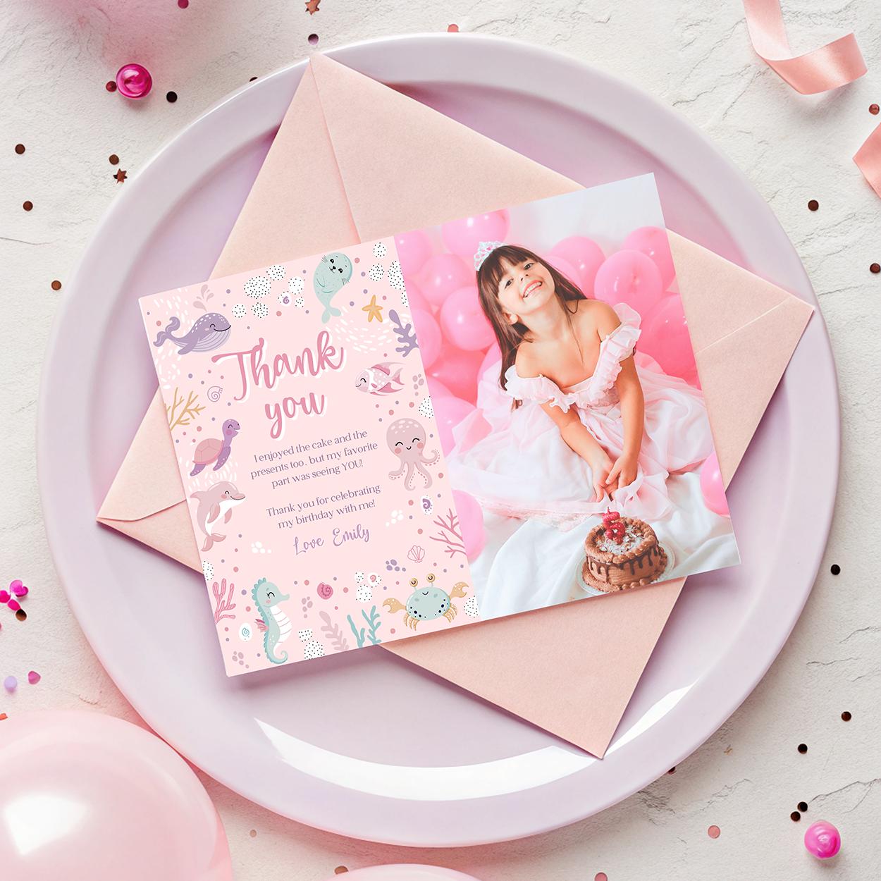 Celebrate your little girl's special day with our charming "Under the Sea Thank You Card." This delightful thank you printable features an enchanting under the sea theme, making it perfect for girls celebrating their birthday.