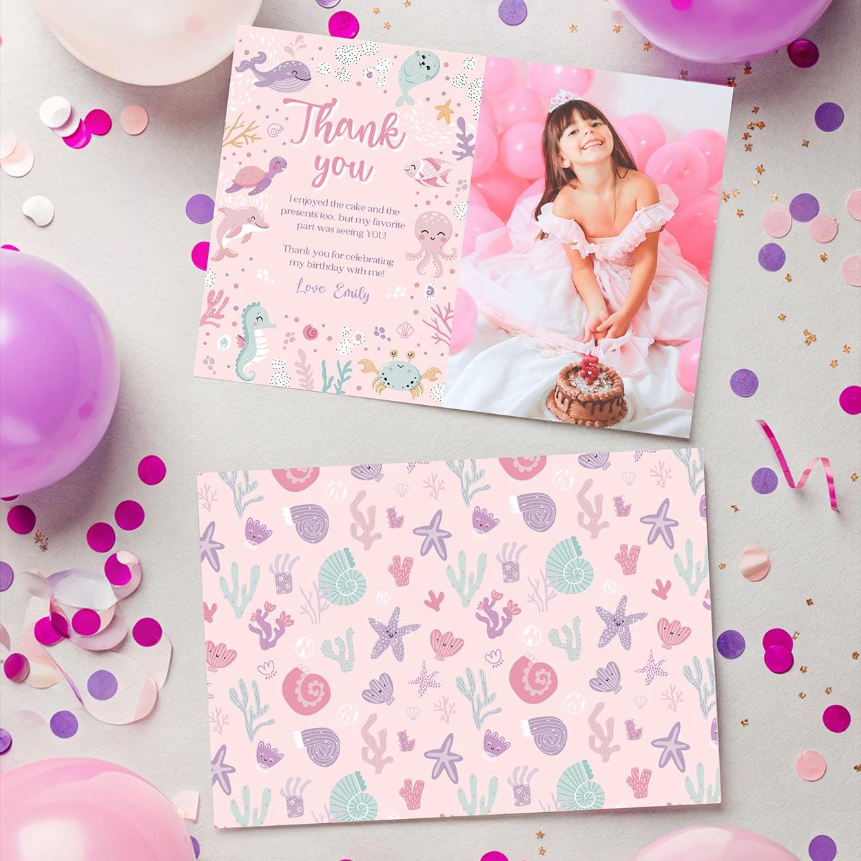 Get ready to impress your guests with these beautiful, easy-to-use thank you note cards tailored for your child's under the sea party!