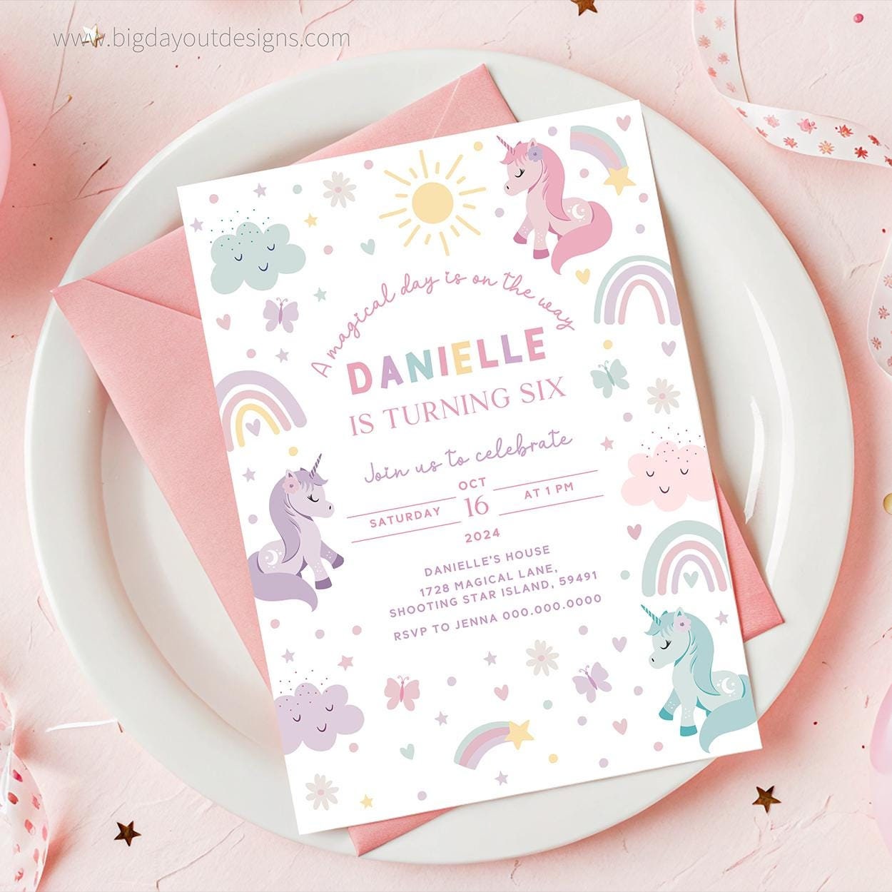 Don't wait—make your unicorn party unforgettable today with this charming and whimsical invite!